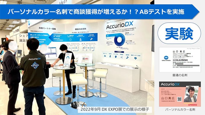 パーソナルカラーが印象をコントロールするという価値だけでなく、ビジネスマンにとって有用なものになると証明できれば、パーソナルカラー名刺を使う人が増える。我々としては、名刺印刷が増えることで、我々の機械も使っていただける…、両社にとってビジネス成長の可能性が広がるチャンスだと思いました。実際に、普通の名刺よりもパーソナルカラー名刺のほうが2.1倍も商談に繋がり、効果を証明することもできました。