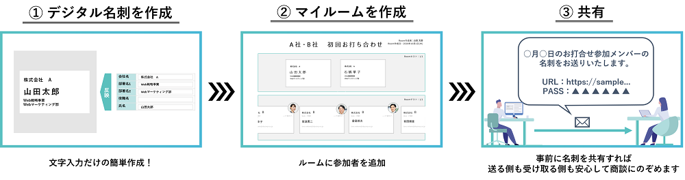 次に、作成したデジタル名刺を渡すために、名刺交換の場となる「マイルーム」を作成します。 例えば、A社とB社が初めて商談を行う場合に、「A社・B社 初回お打ち合わせ」という名前のマイルームを作成し、そのルームの中に参加者を追加します。 マイルームの作成が完了したら、登録した参加者に招待メールが配信されます。 招待された方は、メールに記載されているURLをクリックしパスワードを入力することで、参加者のデジタル名刺を閲覧可能となります。