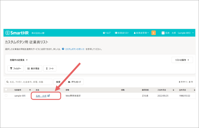 NAMEROOMへ連携する社員のお名前をクリックします。