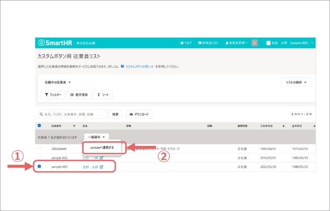 初期設定が完了したら、あとは連携したい従業員を選んでボタンをクリックするだけ。名刺発注に必要な情報がNAMEROOMに自動で連携されます。