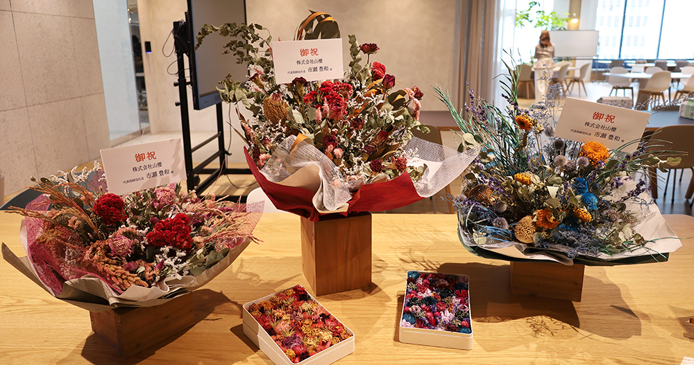 会場は、日本橋の共創型オフィス「ViCreA 東京」。自然光とグリーンの爽やかな雰囲気を感じる空間に、サステナブルなアイテムが並び、入った瞬間からワクワク感が止まりません!受付ではロスフラワーのお祝い花を飾り、細部にまでこだわりを感じられる演出を行いました。