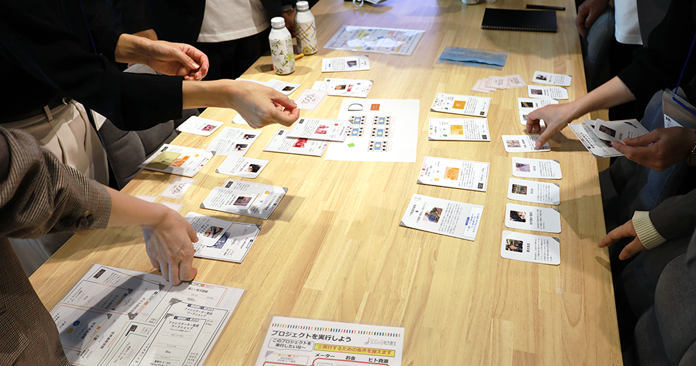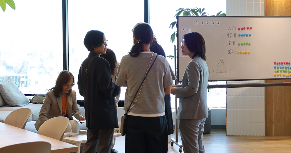 続いて、株式会社シェダルの代表取締役 福田多美子氏をファシリテーターに迎え、カードを使って、持続可能な町づくりをシミュレーションするゲームを行いました。チームで議論しながら進めるので、自然と会話が生まれ、笑顔があふれる時間に。「ゲームなのに、リアルな課題が見えてくる!」という声も多く寄せられました。地方創生を身近に感じられるこのゲーム型研修は、楽しみながら学べる実践的なプログラムとして、ぜひ多くの方に体験していただきたいと思いました。